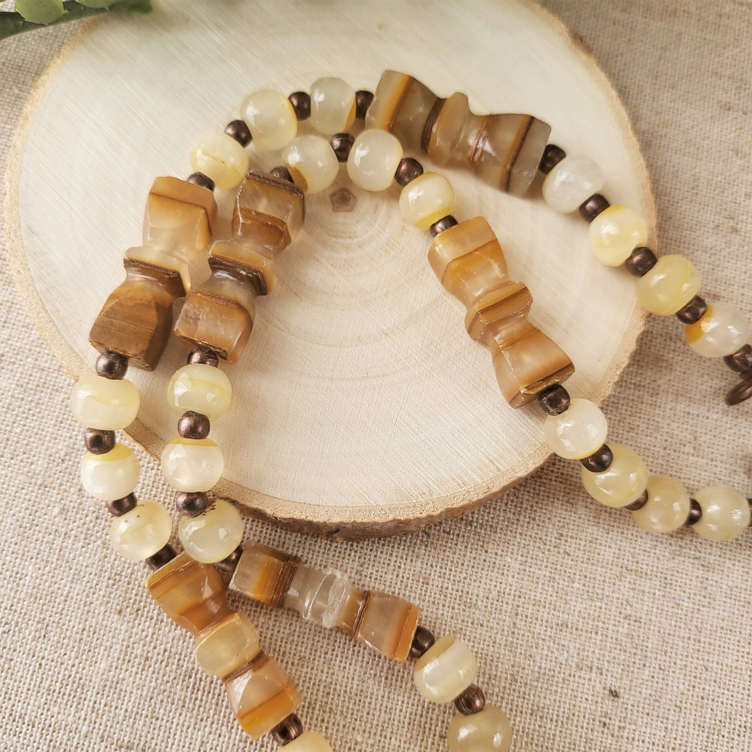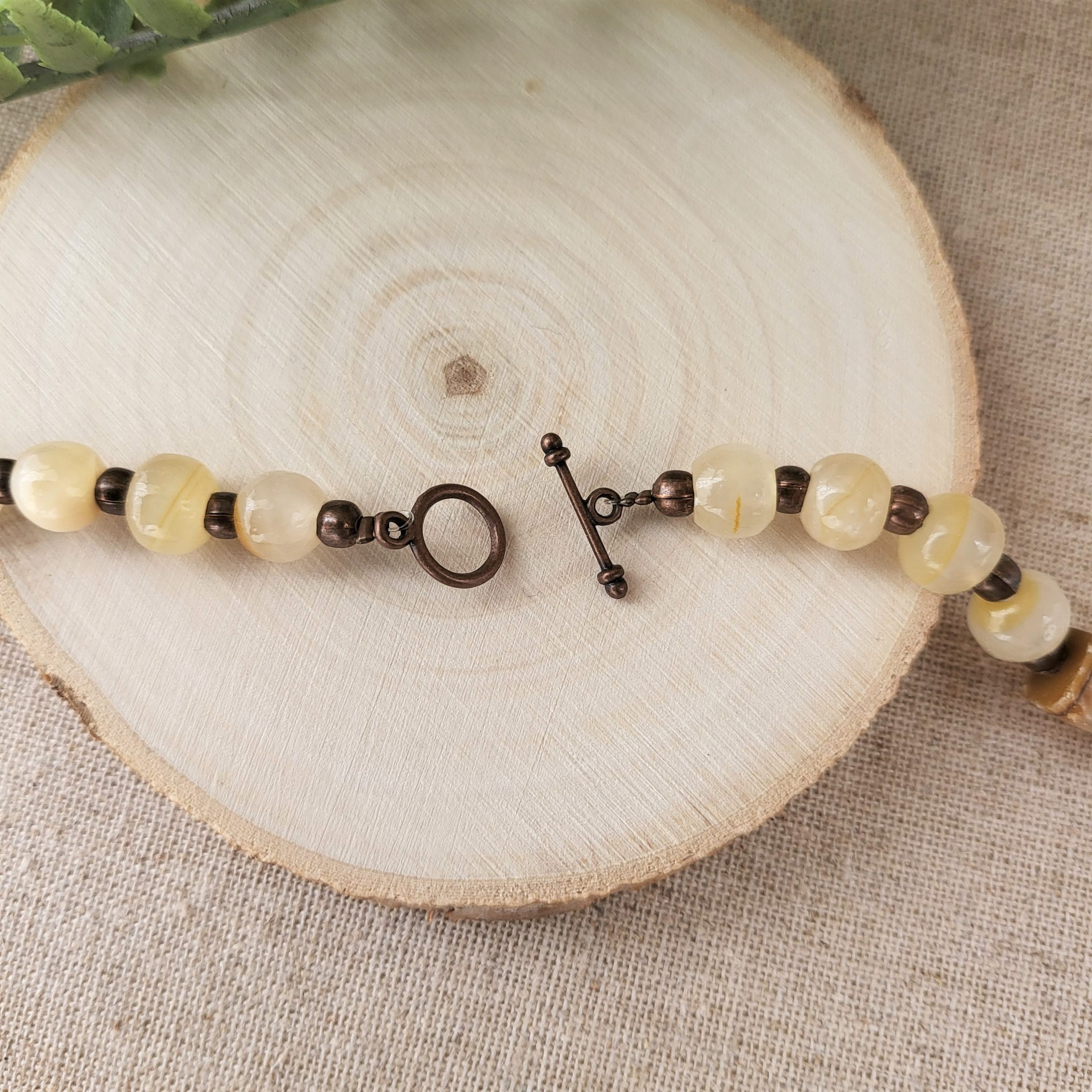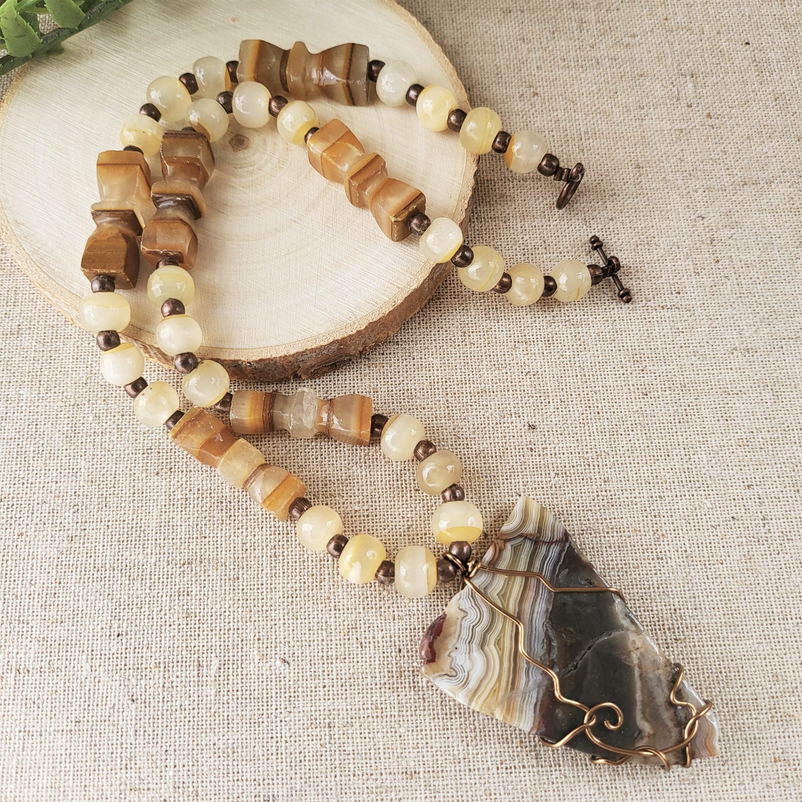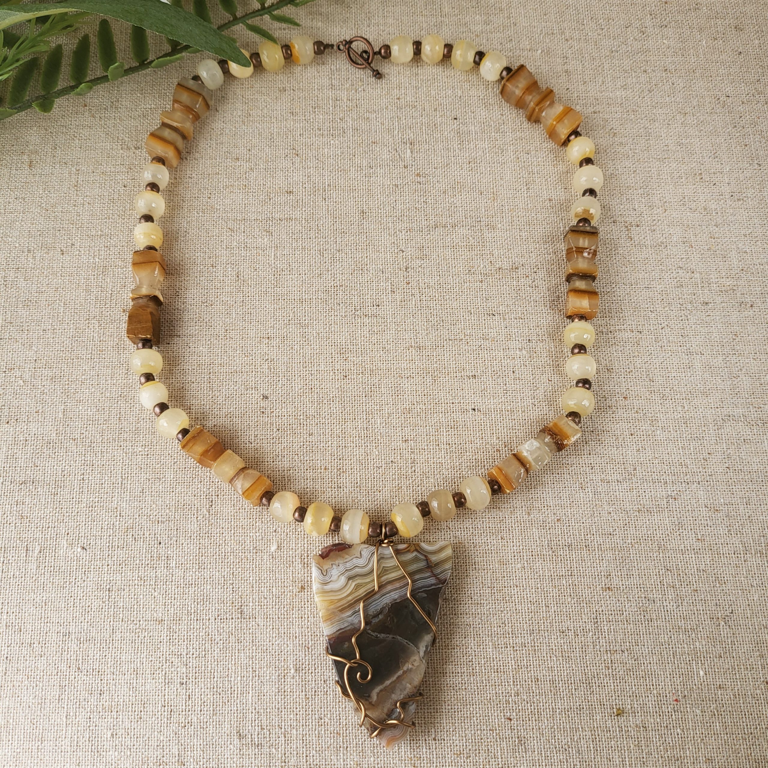 Arrow Head necklace feature wire wrapped roughly cut brown agate stone triangular shape pendant, on beaded necklace with round pale yellow agate beads and hourglass shaped beads. Antique copper tone toggle clasp.