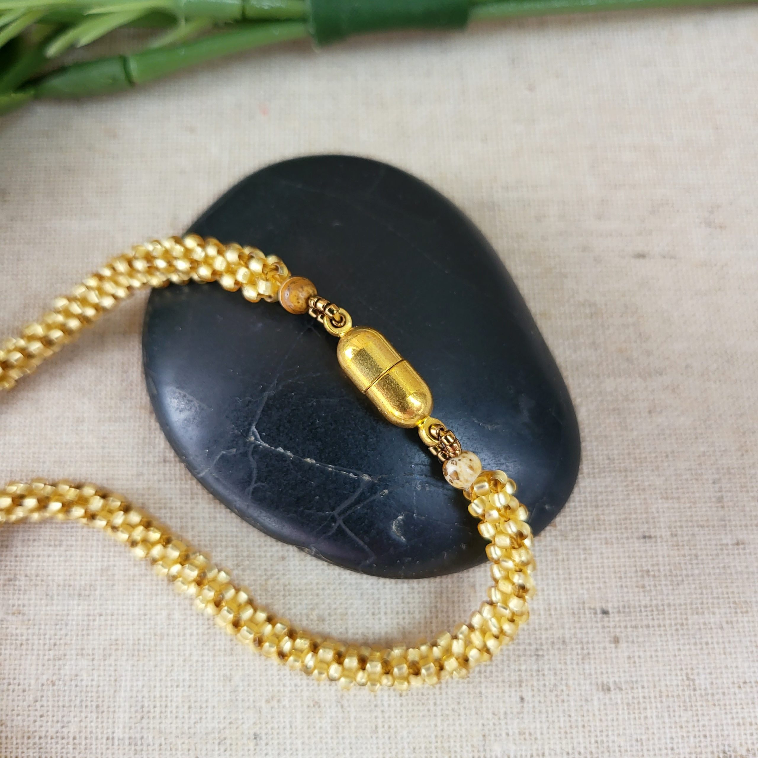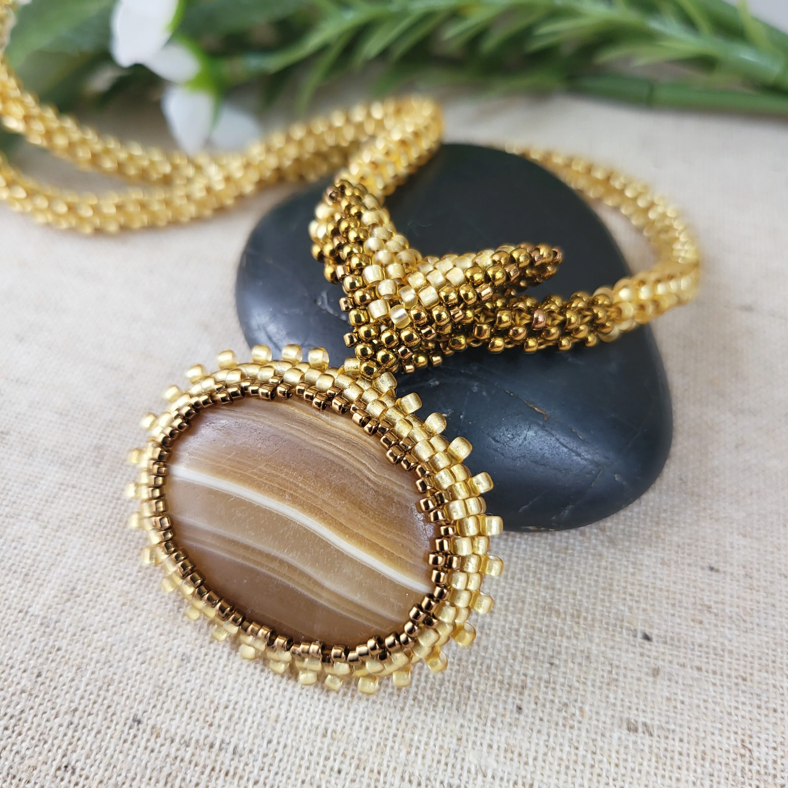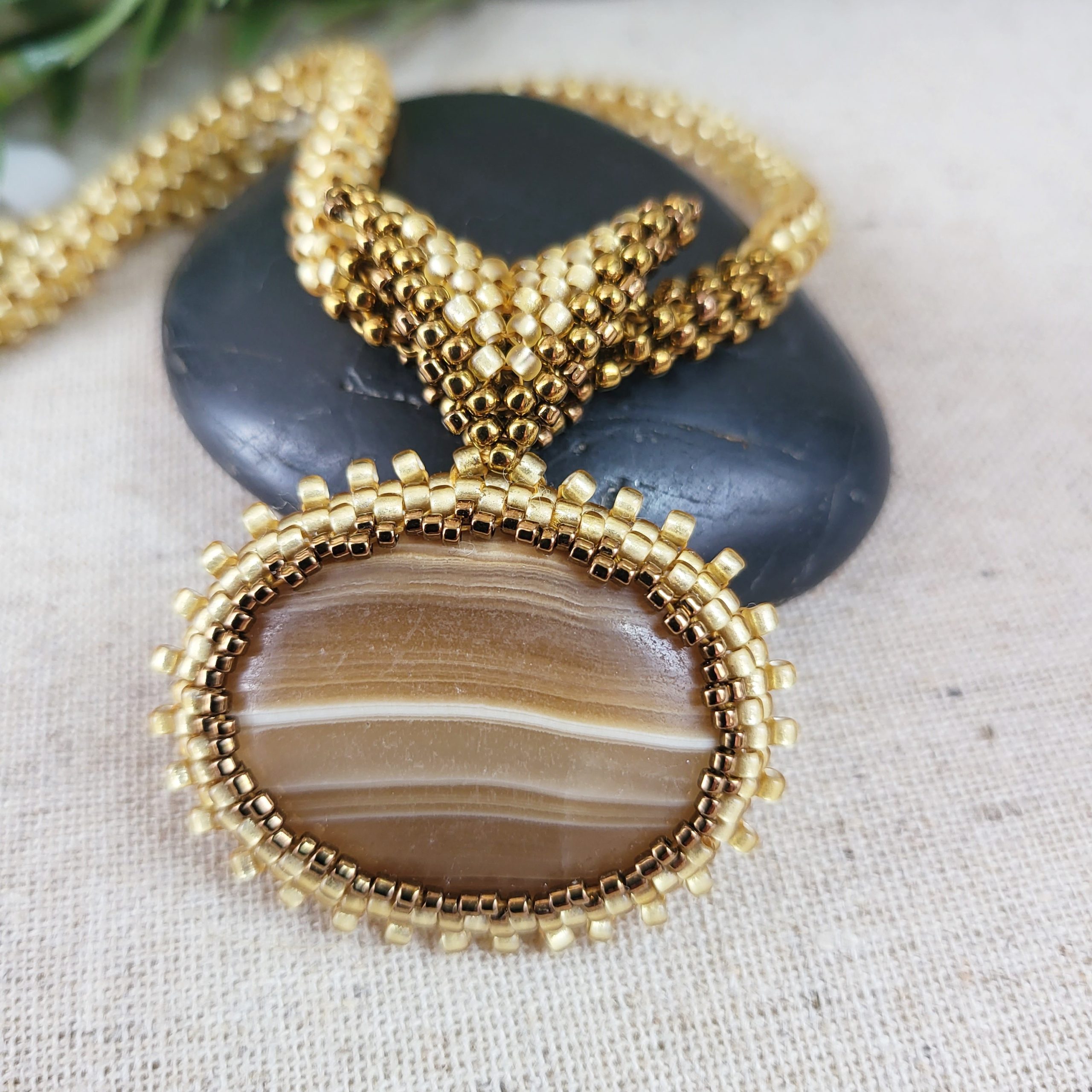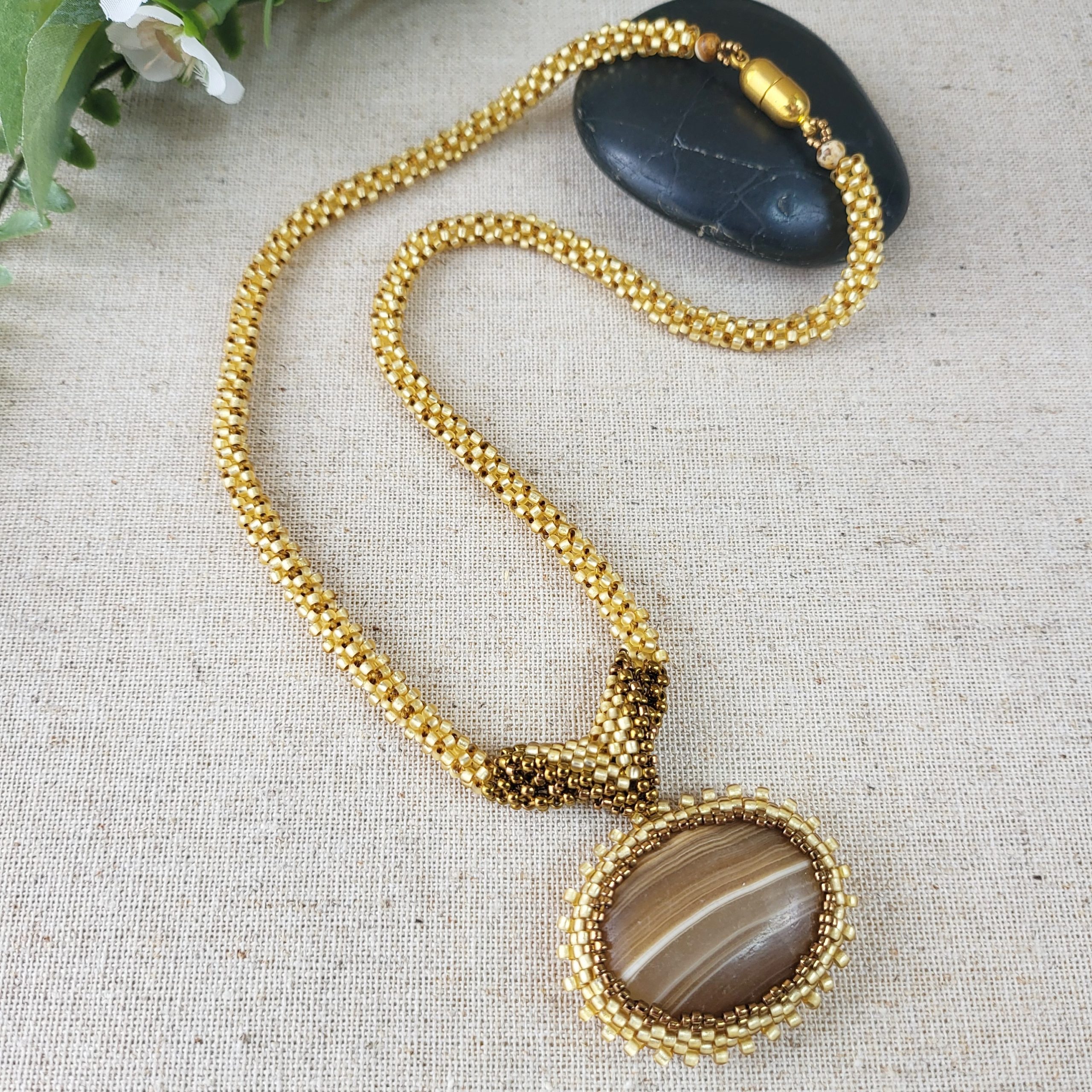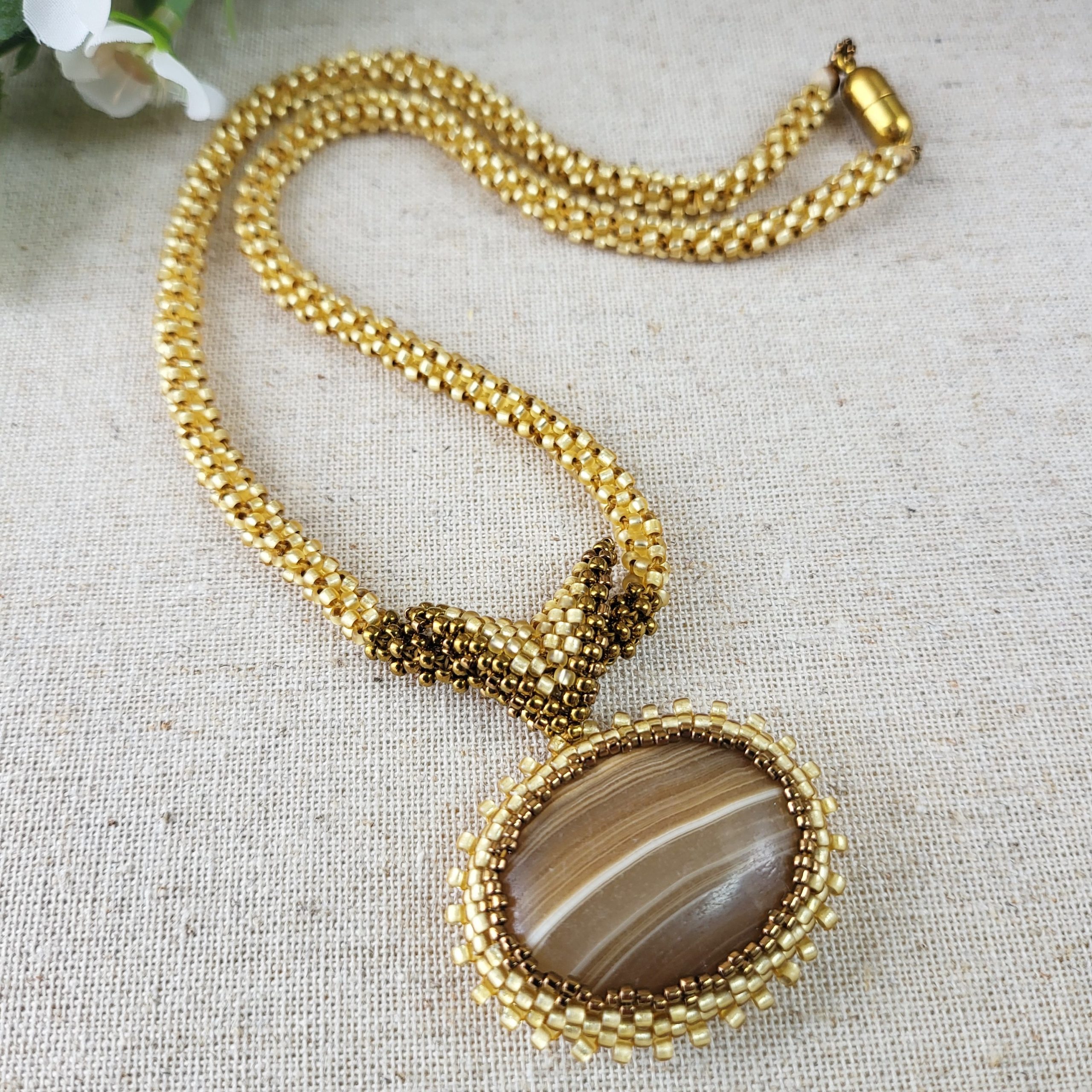 This necklace showcases an oval cabochon of brown banded agate delicately enclosed in a seed bead bezel and bail. The necklace itself is crafted in a round rope style. The seed beads used are Japanese Toho glass in a combination of pale gold and dark gold. The clasp is magnetic and has a gold-tone finish.