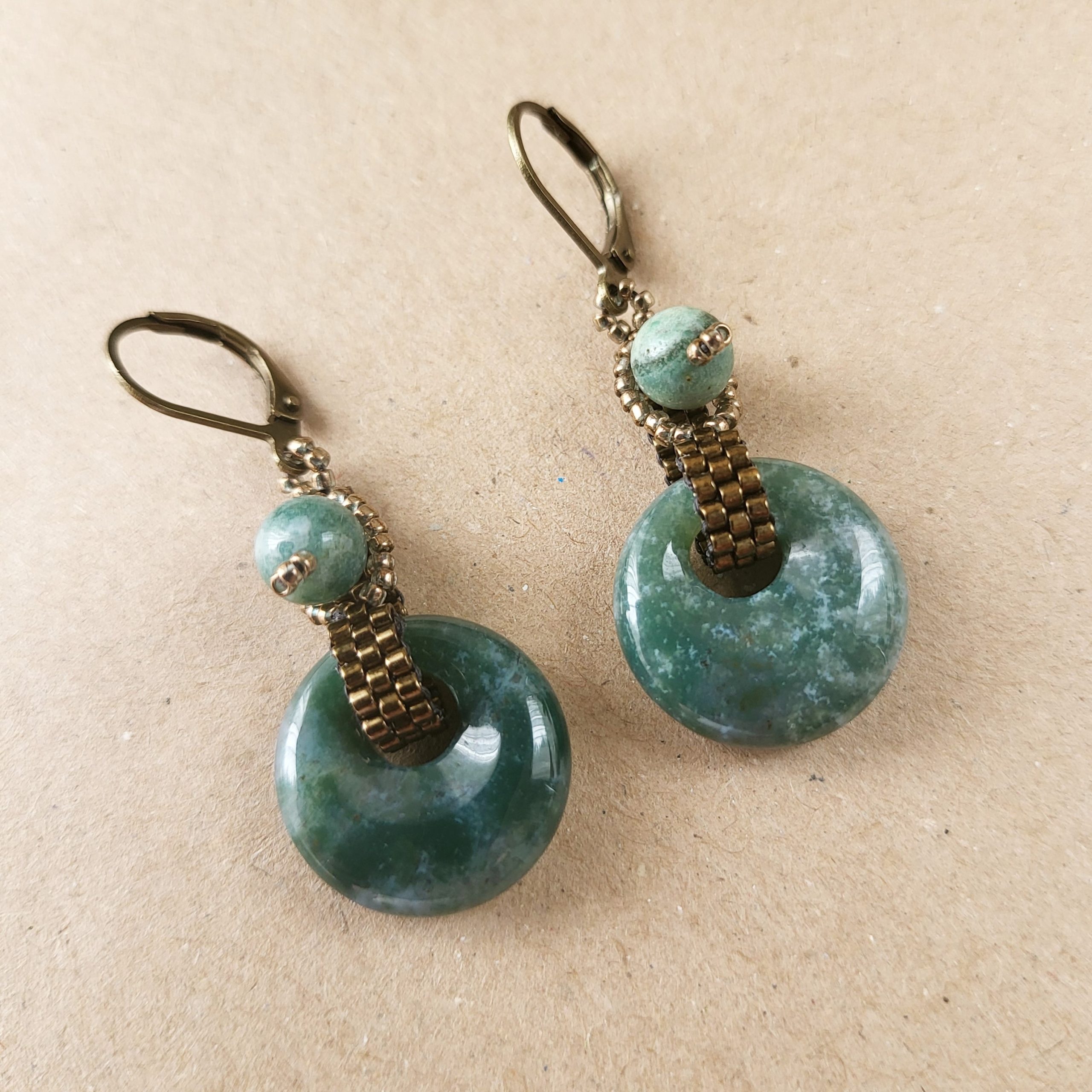 The Rainforest earrings are made with green Indian agate doughnuts (18 mm), captured in a loop of Japanese glass seed beads in bronze, and connected to green Indian agate round beads (6 mm). Antique bronze tone leverback hooks.