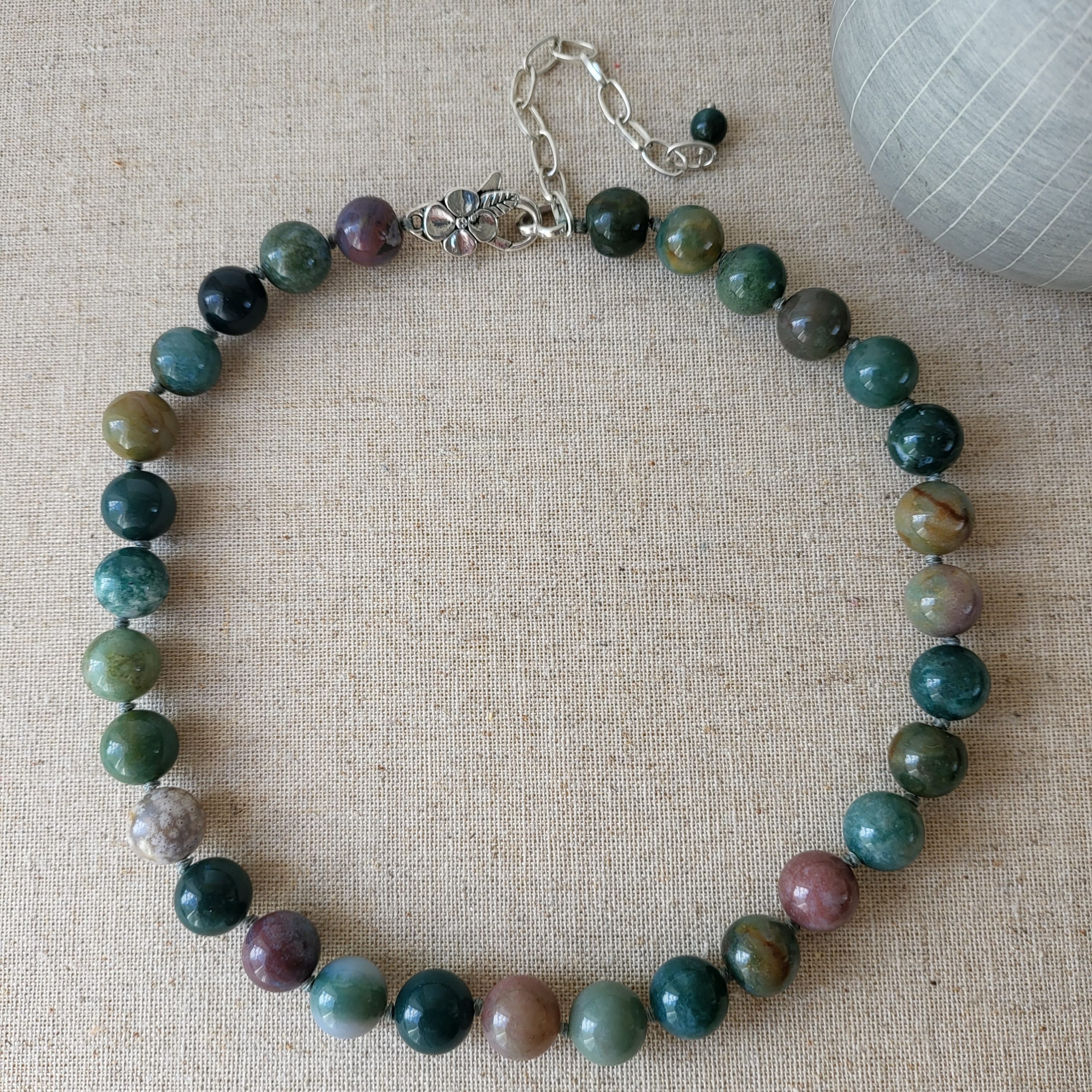 Handmade necklace with Indian agate round beads in shades of green and some brown tones. Hand knotted on a green cotton cord. Finished with a silver tone lobster clasp with a flower, and extension chain.