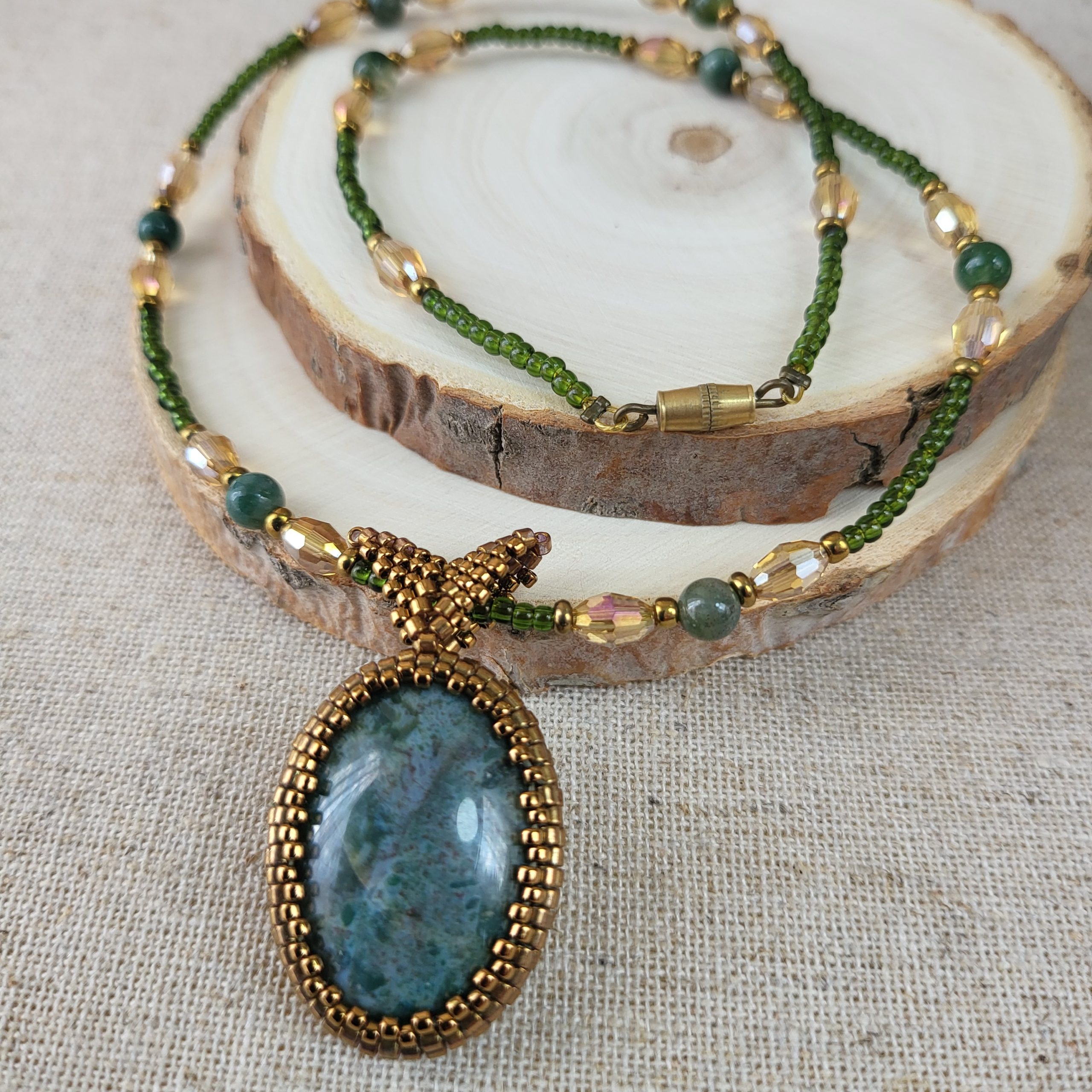 The Rainforest necklace is a delicate necklace made with Japanese glass seed beads in green and gold, topaz-colored glass crystals, and 4mm round green agate beads. The pendant features a beautiful Indian green agate cabochon encased in a bronze seed bead bezel and bail. The necklace is finished with a small screw-on barrel clasp.